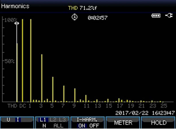 Uno de los principales problemas en las instalaciones eléctricas modernas es la presencia de armónicos, generados por equipos electrónicos como variadores de frecuencia, iluminación LED y dispositivos con fuentes de alimentación conmutadas. Estos armónicos distorsionan la señal de corriente y pueden afectar la eficiencia de los transformadores, motores y otros equipos conectados. El PeakTech 4145 tiene la capacidad de realizar un análisis detallado de los armónicos de tensión y corriente hasta el orden 50, en sistemas tanto monofásicos como trifásicos.